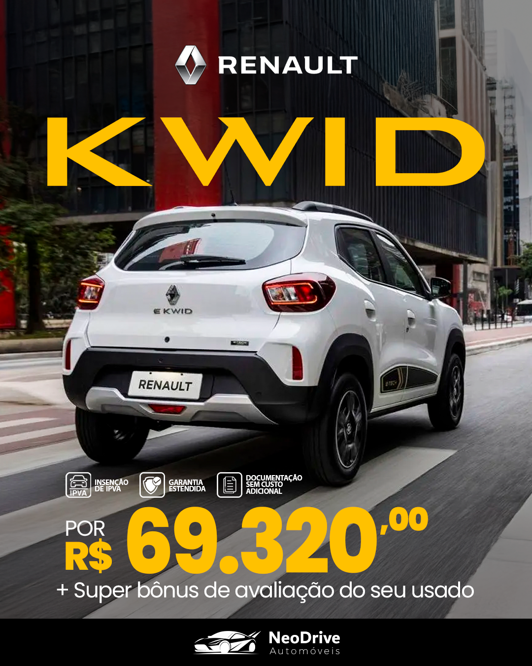 Com benefícios como isenção de IPVA, garantia estendida e documentação gratuita, as peças posicionam a NeoDrive como uma concessionária moderna, acessível e alinhada ao desejo do consumidor.